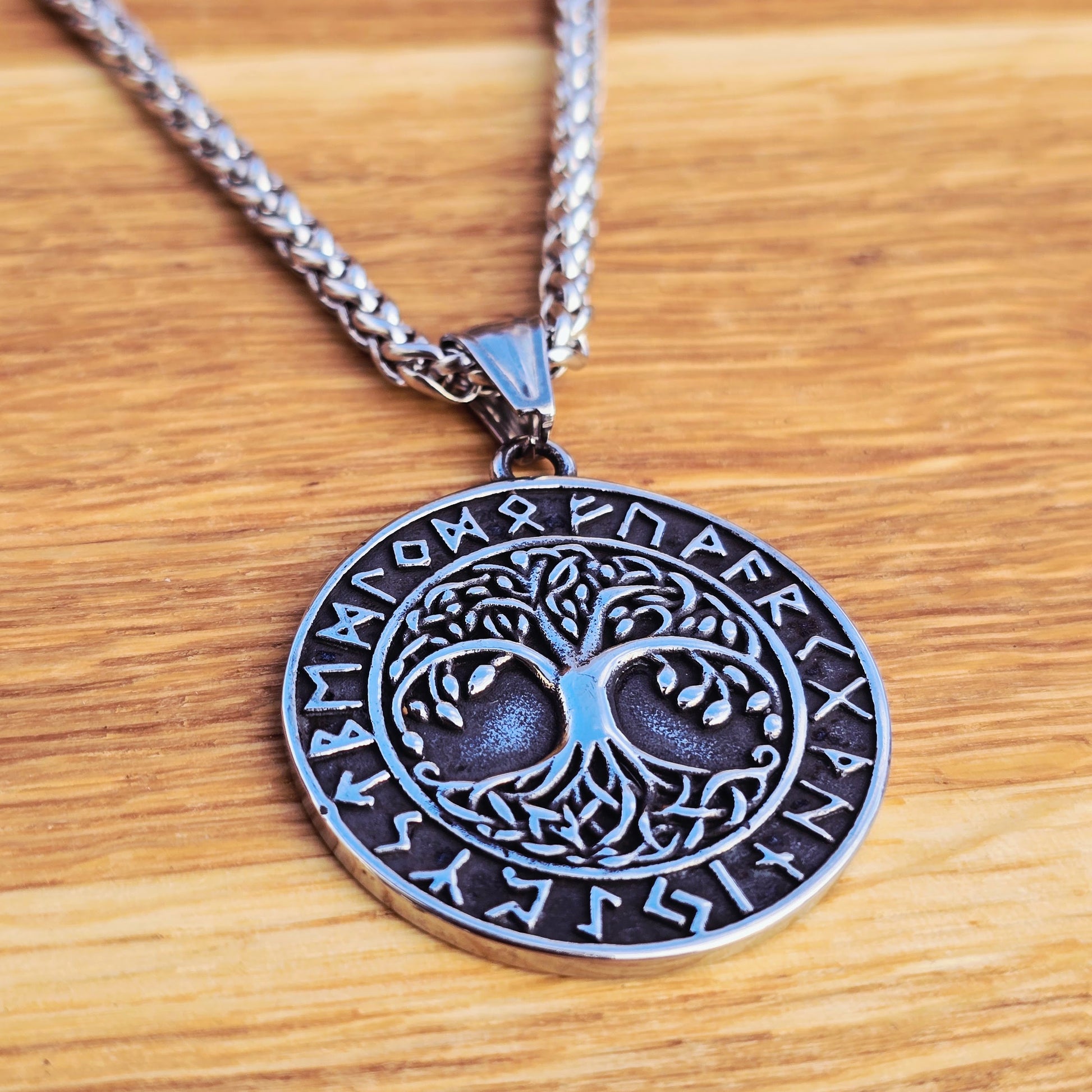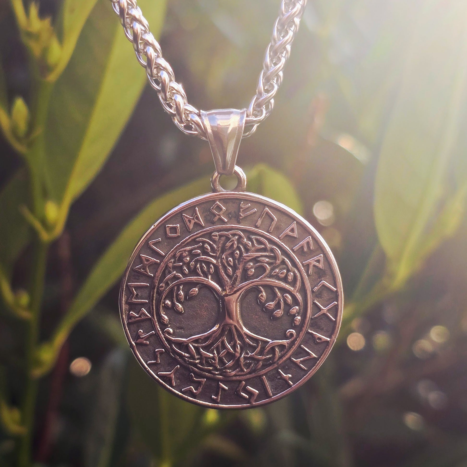 Der Baum des Lebens ist ein universelles Symbol, das die Verbindung zwischen allen Lebewesen und das ständige Wechselspiel zwischen Leben, Tod und Erneuerung darstellt. Die Runen, die den Anhänger umgeben, tragen die spirituelle Kraft der nordischen Mythologie in sich und verleihen der Halskette eine tiefere symbolische Bedeutung. Ein perfektes Schmuckstück für alle, die sich der Weisheit der Natur und der nordischen Tradition stark verbunden fühlen.